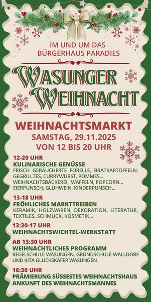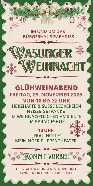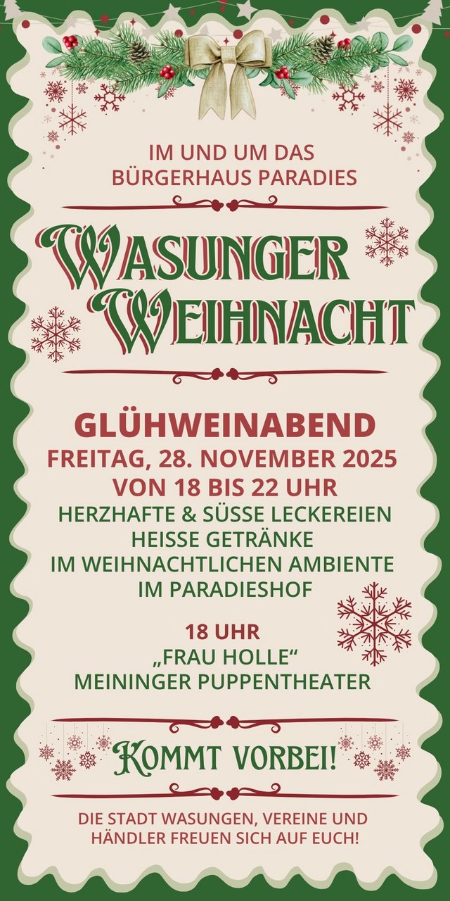 Die Stadt Wasungen lädt gemeinsam mit Vereinen und regionalen Händlern herzlich zur Wasunger Weihnacht am 28. und 29. November 2025 ein. Besucherinnen und Besucher dürfen sich auf zwei stimmungsvolle Tage voller Genuss, buntem Programm und weihnachtlicher Atmosphäre in und um das Bürgerhaus Paradies, Bahnhofstraße 5, freuen.